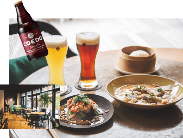 コエドビール特別醸造用のタンクが併設されたレストラン。ここでしか飲めない種類も!スタイリッシュな中華料理とのペアリングが楽しめます。