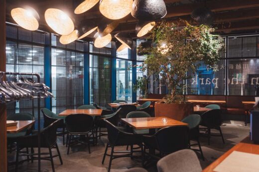(下)広々としたシックな店内。朝食ビュッフェ
